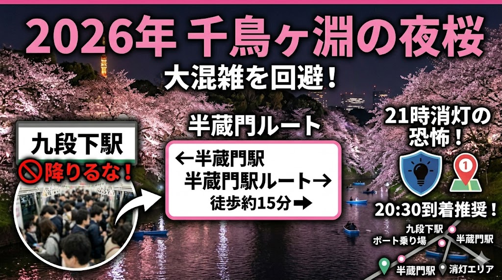 【2026年】千鳥ヶ淵の夜桜は「九段下」で降りると詰む!混雑回避の「半蔵門ルート」と21時消灯の恐怖!